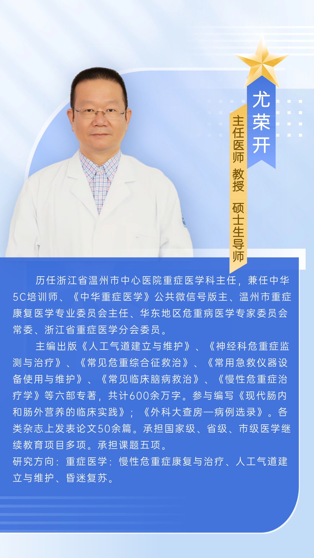 历任浙江省温州市中心医院重症医学科主任。兼任中华5C培训师、《中华重症医学》公共微信号版主、温州市重症康复医学专业委员会主任、华东地区危重病医学专家委员会常委、浙江省重症医学分会委员。